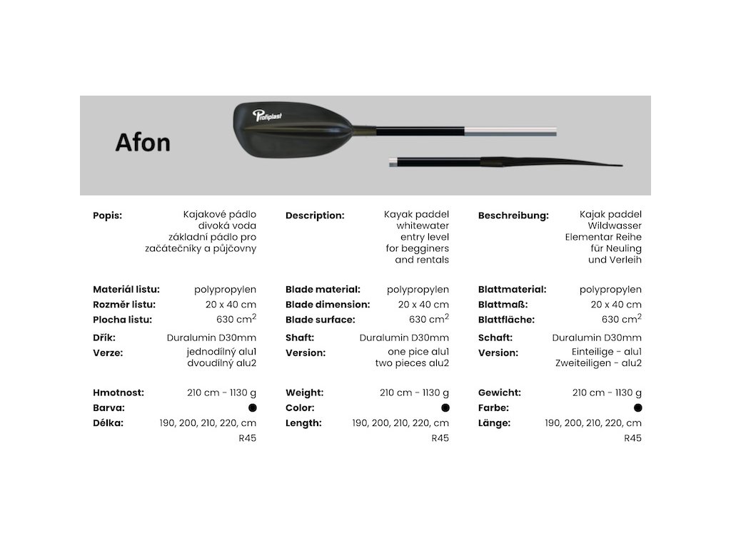 Dvoudílné kajakové pádlo AFON alu2 od českého výrobce Profiplast je navrženo pro maximální odolnost, pohodlí i efektivitu při záběru. Díky robustní konstrukci je vhodné jak pro klidné řeky, tak pro divokou vodu a vodácké půjčovny.